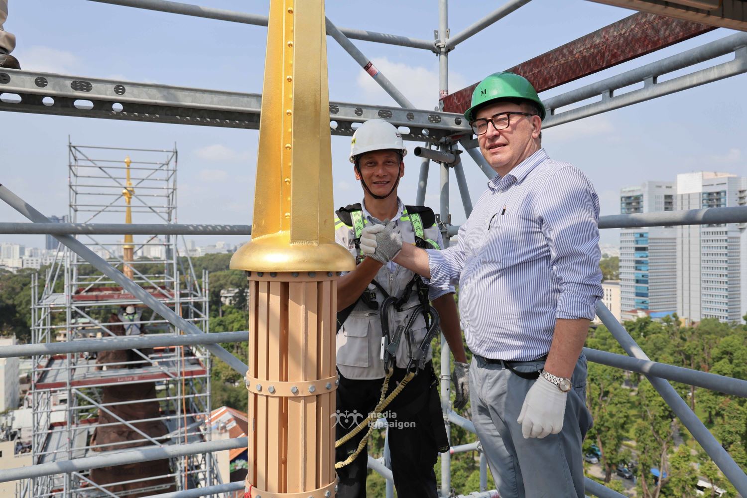 Thánh giá thứ hai được đưa lên đỉnh tháp phía Bưu điện ngay sau đó, hoàn tất cùng quy trình kỹ thuật. Việc lắp đặt hai Thánh giá lớn ở độ cao trên 57 mét đòi hỏi không chỉ sự chuẩn bị kỹ lưỡng mà sự phối hợp chặt chẽ giữa các bộ phận thực hiện từ điều khiển cẩu, nhóm kỹ thuật lắp đặt trên cao và nhóm vận hành, giám sát dưới mặt đất.