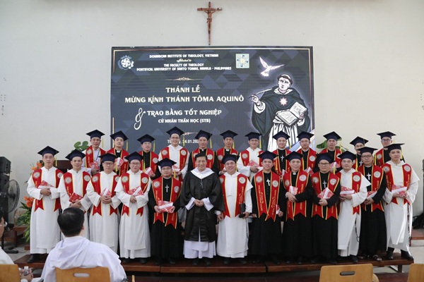 Sau khi lãnh nhận văn bằng, trước sự chứng kiến của cộng đoàn, các tân cử nhân đã long trọng tuyên thệ trung thành với đạo lý và tri thức thánh khoa đã được thụ huấn. Thay mặt Tỉnh Dòng, Cha Giám tỉnh Tôma Aquinô Nguyễn Trường Tam, O.P., đã có lời huấn dụ và khích lệ các tân cử nhân, nhấn mạnh rằng tấm bằng là sự ghi nhận cho những nỗ lực học tập, nhưng không phải là đích điểm của đời sống trí thức, mà là điểm khởi đầu cho những chặng đường mới trong hành trình sứ vụ. Đáp từ, thầy Giuse Nguyễn Phú Quý, O.P., đại diện các tân cử nhân, bày tỏ lòng tri ân đến Ban Giám đốc Học viện, quý Giáo sư và thân nhân đã luôn đồng hành và nâng đỡ.
