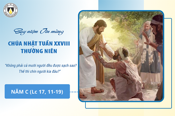 11 Trên đường lên Giêrusalem, Đức Giêsu đi qua biên giới giữa hai miền Samari và Galilê. 12 Lúc Người vào một làng kia, thì có mười người phong hủi đón gặp Người. Họ dừng lại đằng xa 13 và kêu lớn tiếng: “Lạy thầy Giêsu, xin dủ lòng thương chúng tôi!” 14 Thấy vậy, Đức Giêsu bảo họ: “Hãy đi trình diện với các tư tế.” Đang khi đi thì họ được sạch. 15 Một người trong bọn, thấy mình được khỏi, liền quay trở lại và lớn tiếng tôn vinh Thiên Chúa. 16 Anh ta sấp mình dưới chân Đức Giêsu mà tạ ơn. Anh ta lại là người Samari. 17 Đức Giêsu mới nói: “Không phải cả mười người đều được sạch sao? Thế thì chín người kia đâu? 18 Sao không thấy họ trở lại tôn vinh Thiên Chúa, mà chỉ có người ngoại bang này?” 19 Rồi Người nói với anh ta: “Đứng dậy về đi! Lòng tin của anh đã cứu chữa anh”.