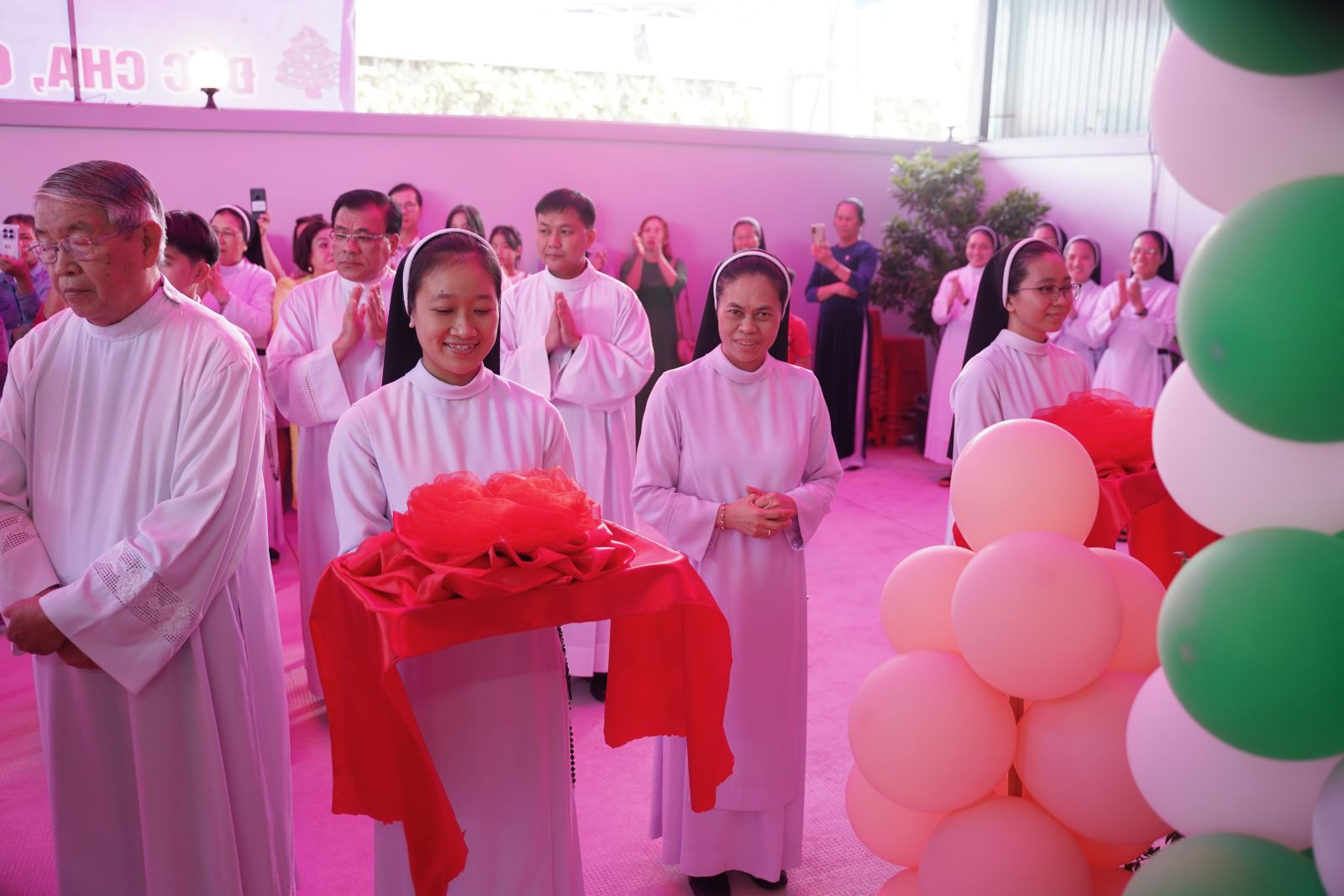 Đúng 9g00, cộng đoàn cùng quy tụ và lắng đọng tâm hồn để xin ơn Chúa Thánh Thần thánh hóa trước khi bước vào nghi thức. Sau Nghi thức Cắt băng khánh thành, Đức cha Gioan đã làm phép thánh hoá ngôi nhà mới. Ngôi nhà mới khang trang sẽ được đưa vào sử dụng với mục đích để quý Xơ tạo môi trường giáo dục tốt nhất cho các em ở lứa tuổi mầm non cả về tri thức, nhân bản và đức tin.