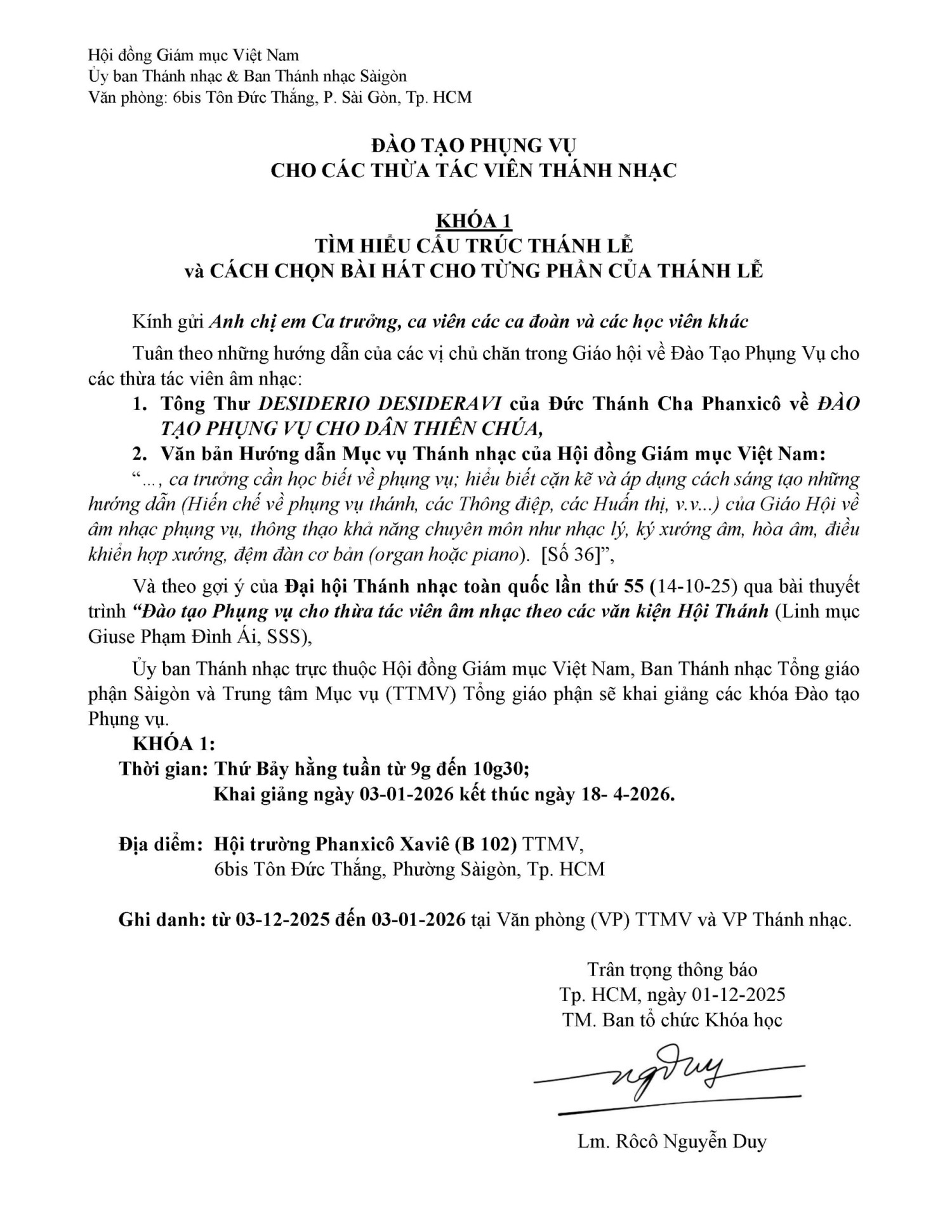 Ủy ban Thánh nhạc trực thuộc Hội đồng Giám mục Việt Nam, Ban Thánh nhạc Tổng giáo phận Sàigòn và Trung tâm Mục vụ (TTMV) Tổng giáo phận sẽ khai giảng các khóa Đào tạo Phụng vụ.