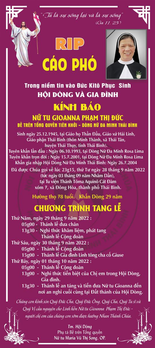 Nữ tu Maria Phạm Thị Hướng, OP. đã được Chúa gọi về lúc 9g20, thứ Sáu ngày 28.02.2025. Kính xin quý Đấng Bậc và quý Vị tiếp tục cầu nguyện cho nữ tu Maria sớm được hưởng Nhan Thánh Chúa.