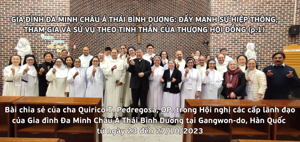 Vì thế, đó cũng là Chủ đề của Hội nghị: Gia đình Đa Minh Châu Á Thái Bình Dương: Củng cố và thúc đẩy sự hiệp thông, tham gia và sứ vụ theo tinh thần Hiệp Hành. Với ánh sáng của chủ đề Hội nghị, trong bài chia sẻ hôm nay, tôi muốn suy gẫm và cùng trao đổi với anh chị em về việc làm thế nào, chúng ta, Gia đình Đa Minh Châu Á Thái Bình Dương, bằng những việc làm cụ thể, có thể đẩy mạnh sự hiệp thông, tham gia và sứ vụ rao giảng Tin Mừng.