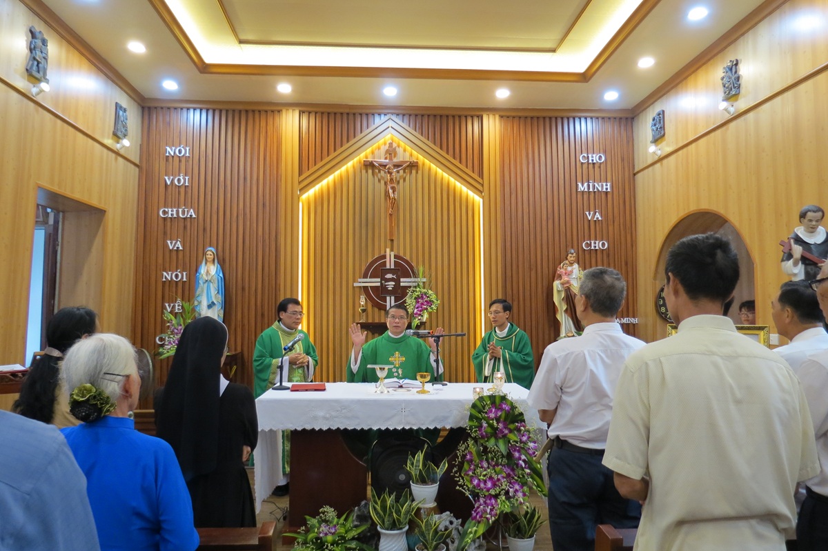 Mở đầu thánh lễ, cha Giuse Đinh Xuân Ngọc – chánh xứ Lê Xá – đã mời gọi cộng đoàn sống tâm tình biết ơn và cầu nguyện cho Xơ Gioanna vì những đóng góp to lớn của Xơ đối với Hội dòng và giáo xứ Ngọc Đồng. Cha cũng nhấn mạnh rằng, chúng ta cần nhạy cảm trước những nhu cầu của người thiếu thốn – không chỉ về vật chất mà còn về tinh thần, tình yêu thương và sự cảm thông. Hãy mang Chúa đến với họ qua đời sống quảng đại và yêu thương của mỗi người.