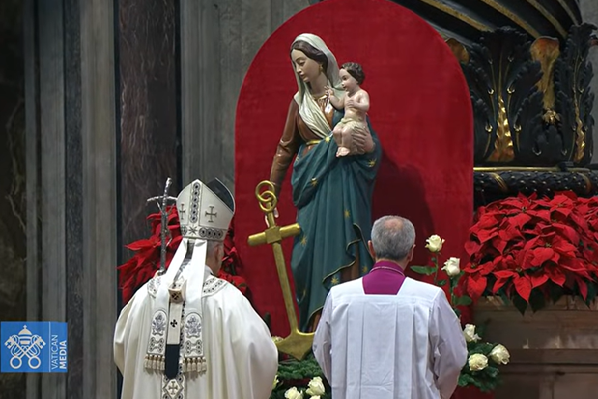 Anh chị em thân mến, trong ngày lễ trọng này, vào đầu năm mới, khi Năm Thánh Hy Vọng sắp khép lại, chúng ta hãy đến với Hang Đá Giáng Sinh trong đức tin, như đến nơi của nền hòa bình “không vũ khí và giải giới” cách tuyệt hảo, đến nơi của phúc lành; tại đó, chúng ta hồi tưởng những kỳ công Chúa đã thực hiện trong lịch sử cứu độ và trong chính cuộc đời chúng ta. Rồi từ đó, như những chứng nhân khiêm hạ của hang đá, chúng ta lên đường, “vừa tôn vinh vừa ca tụng Thiên Chúa” (Lc 2,20) vì tất cả những gì chúng ta đã thấy và đã nghe. Ước gì đó là cam kết, là quyết tâm của chúng ta cho những tháng ngày sắp tới, và cho toàn bộ đời sống Kitô hữu của chúng ta.