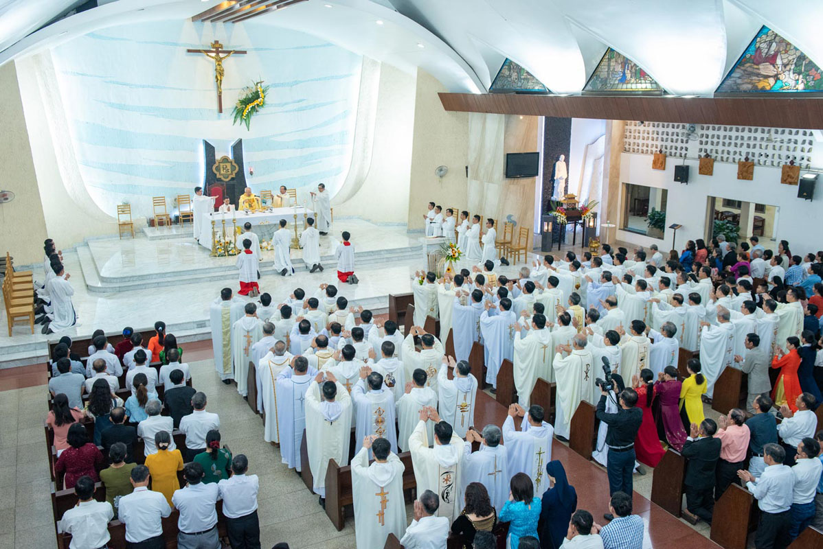 Cùng hiệp dâng trong thánh lễ do Đức giám mục Phaolô chủ tế có cha giám tỉnh Tôma Aquinô Nguyễn Trường Tam, O.P., quý cha tu viện trưởng, quý cha giáo Học viện, quý cha quý thầy trong Tỉnh dòng, quý cha thân hữu cùng cộng đoàn dân Chúa là quý ông bà cố, quý thân nhân các tiến chức và bà con trong giáo xứ.