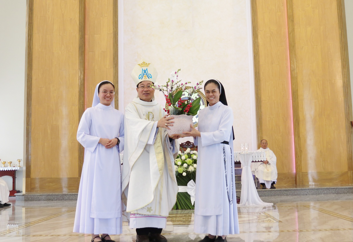 Sau Thánh lễ, chị Tổng Thư ký thay lời cho chị em trong Dòng bày tỏ lòng tri ân và chúc Tết đến Đức cha, quý Cha và quý khách. Trong bầu khí thân tình và hiệp thông, chị Bề trên Tổng quyền, đại diện cho toàn thể chị em trong Hội dòng kính dâng lên Đức cha một lẵng hoa tươi thắm, thay cho tấm lòng yêu mến, biết ơn và hiếu thảo của chị em trong Dòng đối với vị chủ chăn của Giáo phận.